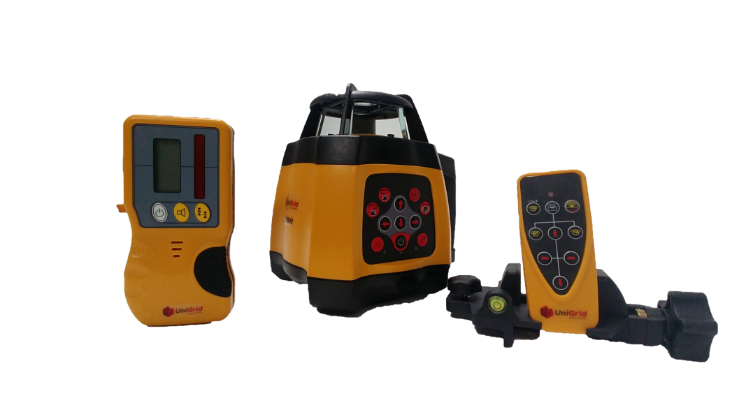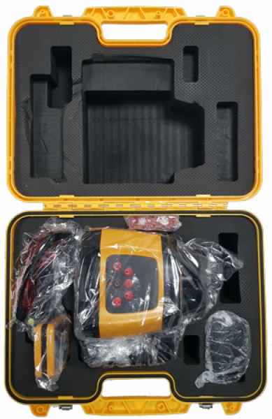 Accesorios incluidos: Maletin rigido, detector con soporte para láser, pack de baterías NiCd para láser, cargador de baterias, control remoto, gafas rojas intensificadoras, señal imantada roja, soporte para detector